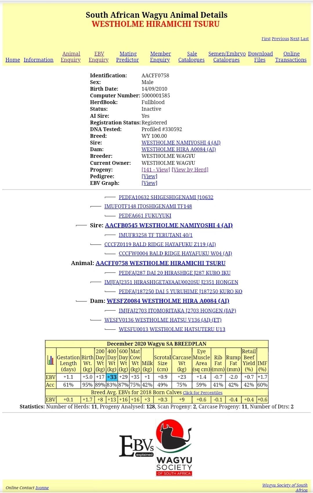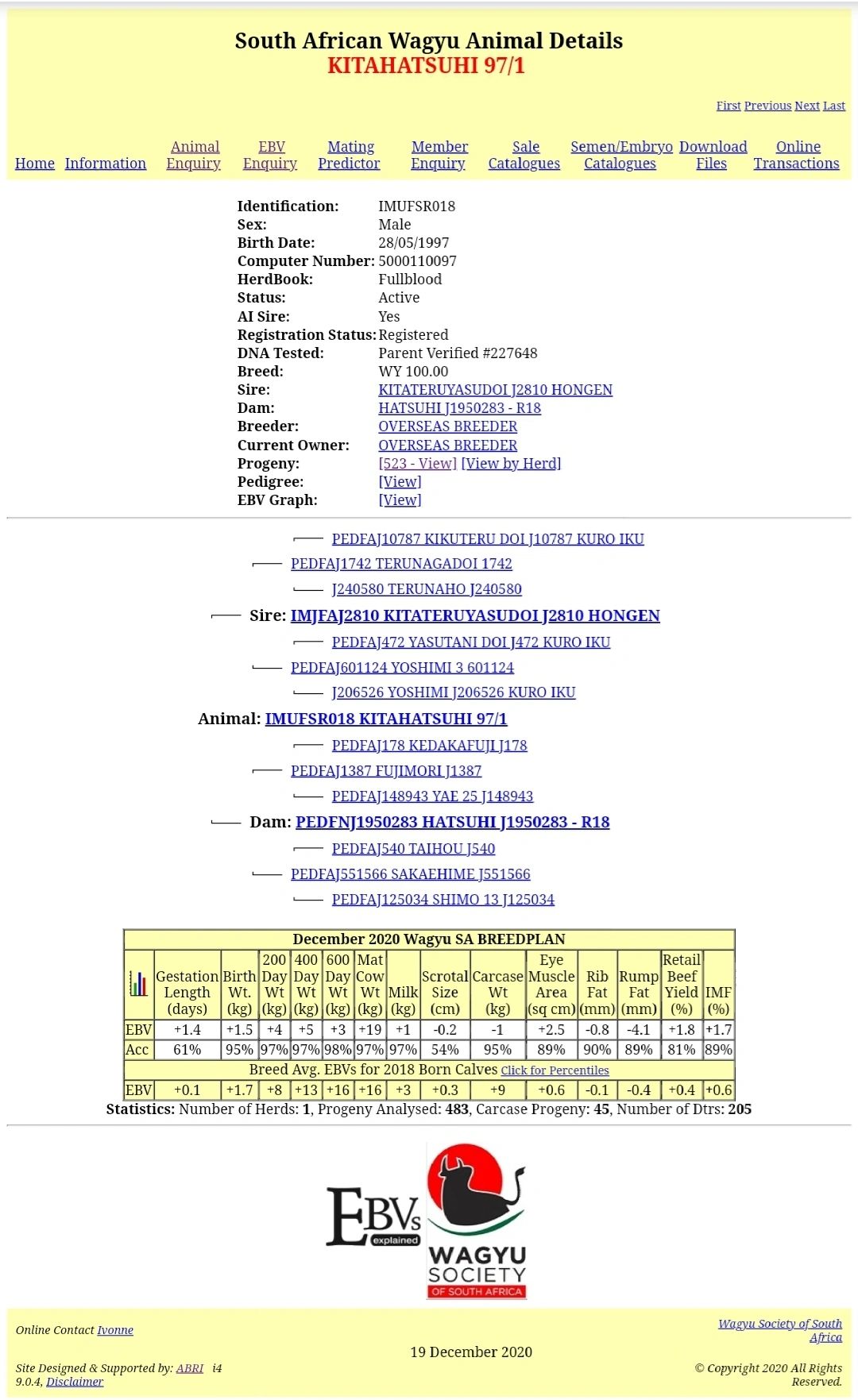 The Hatsuhi maternal line has proven to be one of the elite Westholme maternal lines. Hatsuhi is widethly regarded as the best Kedaka/Tottori cow to have been exported from Japan. Hatsuhi has produced such top sires as Westholme Haramichi Tsuru, who has impressive Indexes of $228 SRI/ $219 FTI/ 188 F1TI!! This family combines elite growth EBVs with staggering marbling and carcass traits. Other succesful sires from this maternal line include the legendary growth sire Kitahatsuhi 97/1, Peppermill Grove D139, Longford F E0241, and Goorambat Doublesixty K473.